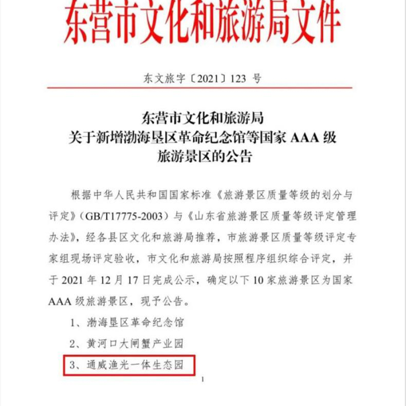 近日,东营市文化和旅游局公布了全市新增国家AAA级旅游景区名单,通威东营渔光一体生态园成功评定为国家AAA级旅游景区,这是继2019年黄河口知青小镇获批国家AAA级景区以来东营市垦利区第二家AAA级旅游景区。